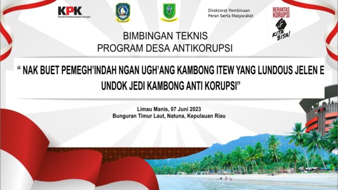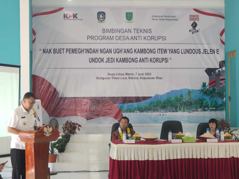 Rabu (7 Juni 2023), Desa Limau Manis, Kec. Bunguran Timur Laut, Kab. Natuna – Komisi Pemberantasan Korupsi (KPK) melalui Direktorat Pembinaan Peran Serta Masyarakat menggelar acara Bimbingan Teknis Program Desa Anti Korupsi di Natuna Kepulauan Riau, tepat nya di Desa Limau Manis, Kecamatan Bunguran Timur Laut