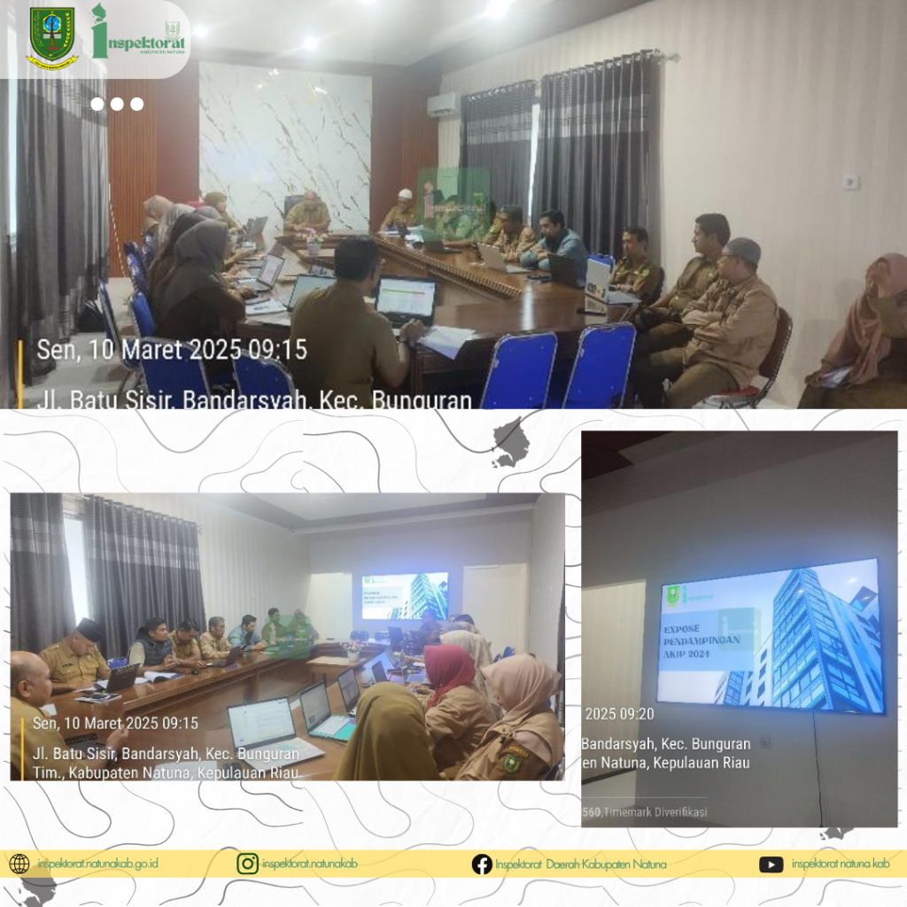 Ranai, 10 Maret 2025 – Pemerintah Kabupaten Natuna melalui Inspektorat Daerah melaksanakan kegiatan Expose Hasil Pendampingan Akuntabilitas Kinerja Instansi Pemerintah (AKIP) Tahun 2024. Kegiatan ini berlandaskan sejumlah regulasi, antara lain Peraturan Presiden Nomor 29 Tahun 2014 tentang Akuntabilitas Kinerja Instansi Pemerintah, PermenPAN-RB Nomor 88 Tahun 2021 tentang Evaluasi AKIP, serta Peraturan Bupati Natuna Nomor 14 dan Nomor 66 Tahun 2023 yang mengatur pedoman evaluasi akuntabilitas kinerja perangkat daerah.